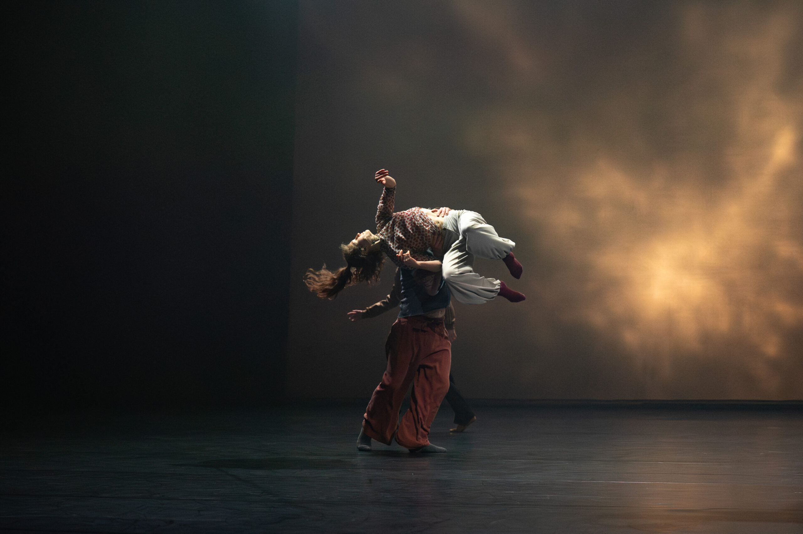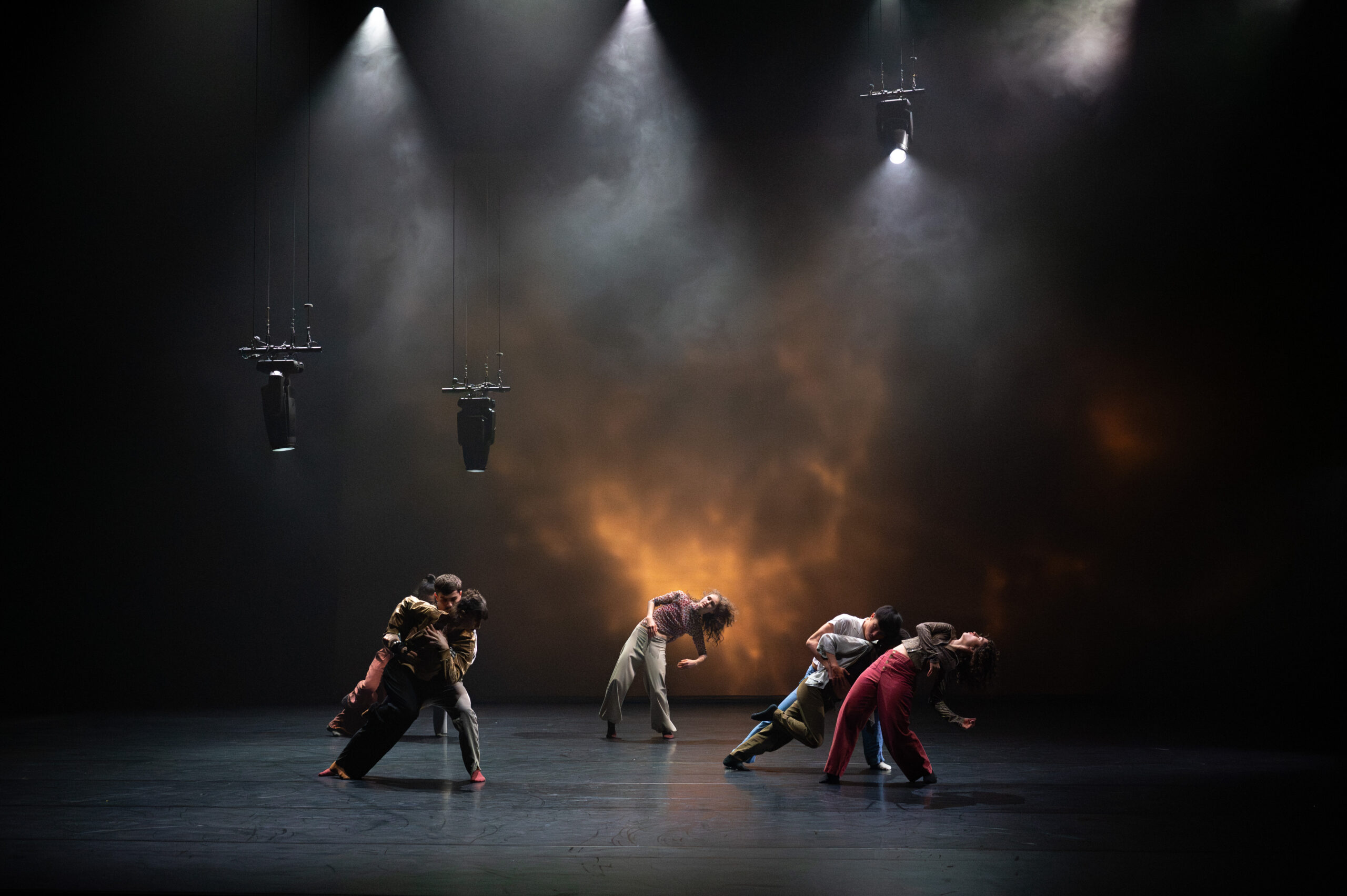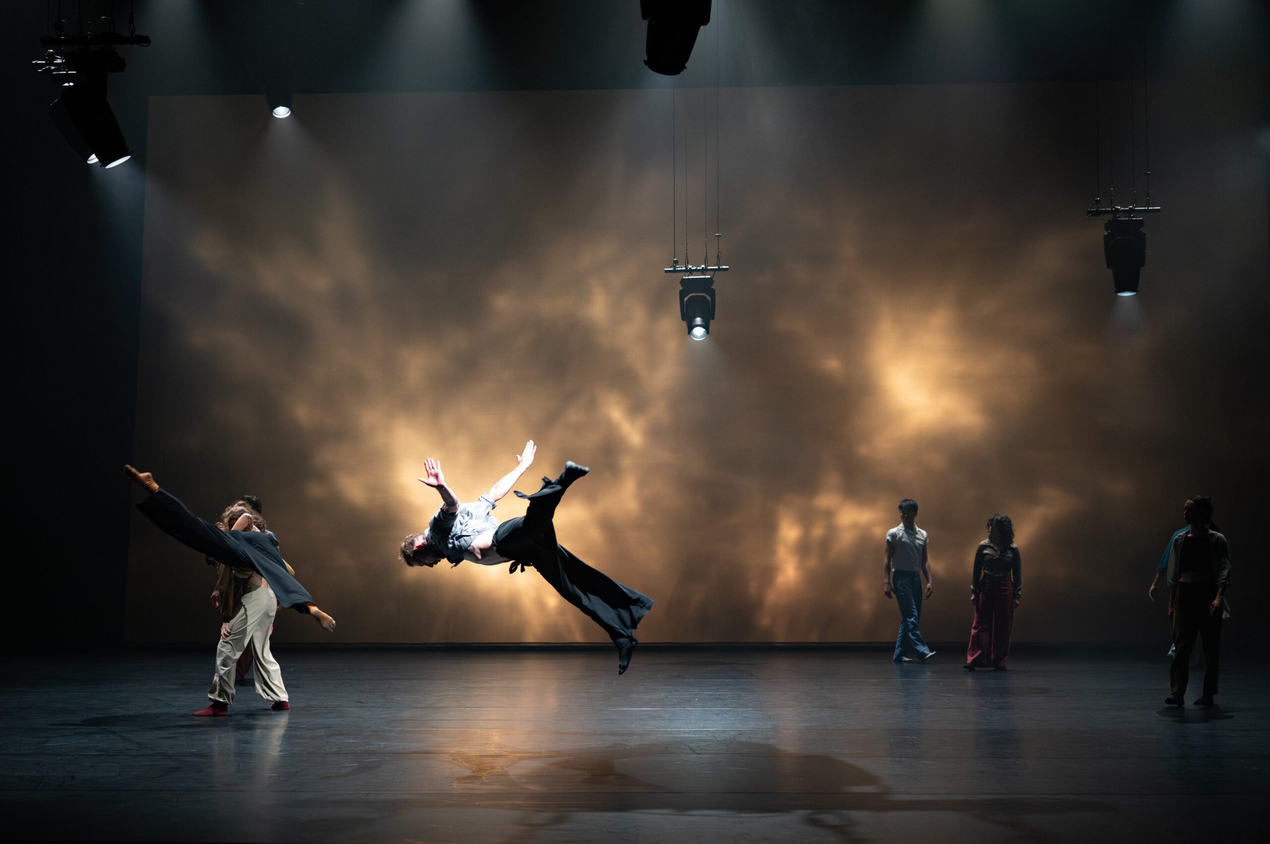 Dans ENSO – Boléro, neuf interprètes mettent en mouvement cette forme infinie, emportés par une partition musicale ternaire ensorcelante. En cercle ou en demi-cercle, de la boucle à l’ellipse, l’ensemble des lumières et des corps ouvre le champ des possibles et happe le spectateur dans un tourbillon.